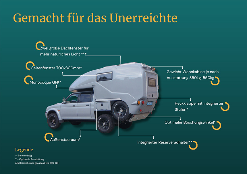 Geocar verbaut ausschließlich hochwertige Komponenten von nahmhaften Herstellern. Bei den Wohnkabinen können Sie aus drei verschiedenen Elektro-Paketen und optionalen Funktionen auswählen.