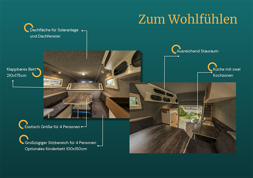 Alle Kabinen kommen standardmäßig mit den maßgefertigten Möbeln, isoliert und tapeziert. Bei der Technik können Sie aus einer breiten Palette an Optionen wählen und passen so die Wohnkabine spielend leicht an Ihre Bedürfnisse an.