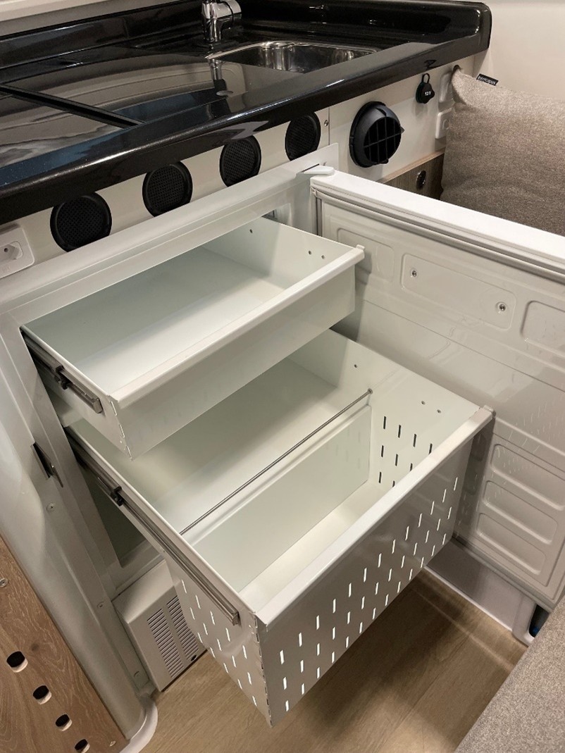 - Küche mit Edelstahlspüle mit warmem und kaltem Wasser, 98 Liter 12V Elber Kühlschrank